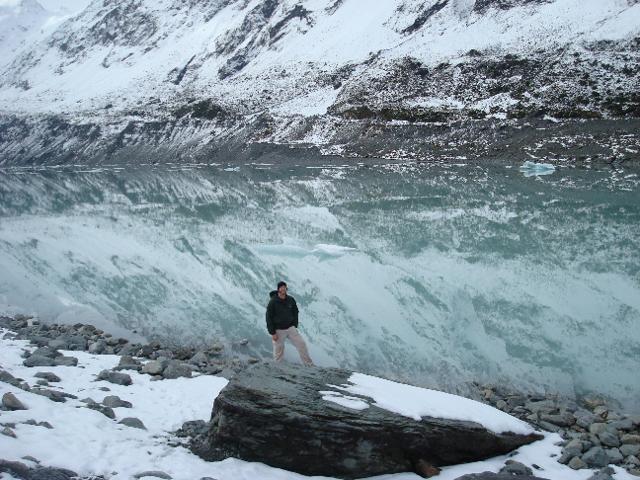 After crossing two swing bridges a la Indiana Jones and tromping through rocks, snow, slush and mud, we came to the lake and the glacier. There was no one there but the two of us. I remember the first time I went to the UK I saw shades of green that I had truly never encountered before. It seems impossible that you could live your life without seeing every shade in the spectrum, but you don’t realize what you’re missing until you see a brand new color. On this day I saw glacier blue. If you’ve never seen a glacier before you may think you know what glacier blue is, but you don’t. I didn’t. And it was everywhere – in the river rushing below the bridges, in the lake, on the mountain. And Mount Cook itself, although not that high (although it is the tallest in New Zealand) looked, dare I say it, mystical with the sun barely breaking through the thick clouds that surrounded it. It’s the kind of beauty that makes you emotional.