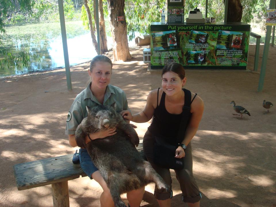 When we arrived I got a bag of food and went after the kangaroos. Adam kept reminding me not to pet the wild kangaroos that we had so often seen around the campgrounds, (I wasn’t going to), so I took the opportunity to get up close to them. As is usual with petting zoo animals, they wanted little to do with the petting and everything to do with the food. I got some good swipes in, though. We wandered around, finally got to see the elusive wombat and some squirrel gliders (all asleep), and headed back to the koala enclosure so I could do my thing. Before the koalas, the employee giving the animal talks brought out the wombat. If you’ve never seen a wombat, they look pretty much like huge guinea pigs. He hauled the sleeping wombat out of her burrow carrying her under her two front legs so that her stomach and back legs protruded comically. It looked a bit uncomfortable, but the wombat, still groggy, didn’t seem to mind much. Not willing to pay to hold two marsupials in one day, I opted to sit next to the handler and give the wombat a pet. They’re quite wiry, almost like a pig.