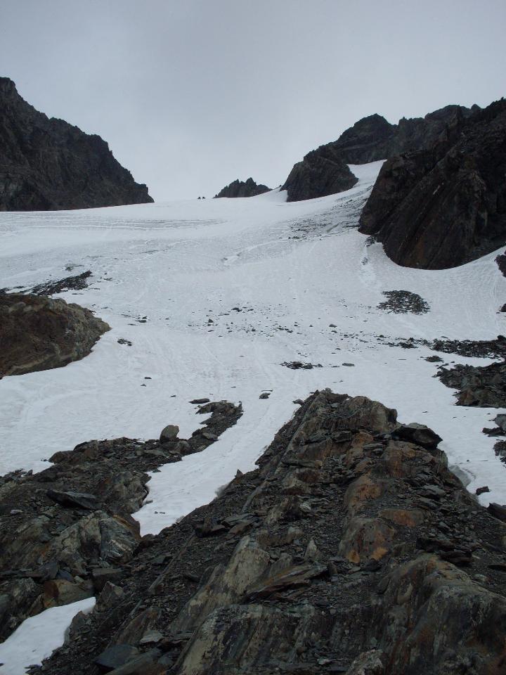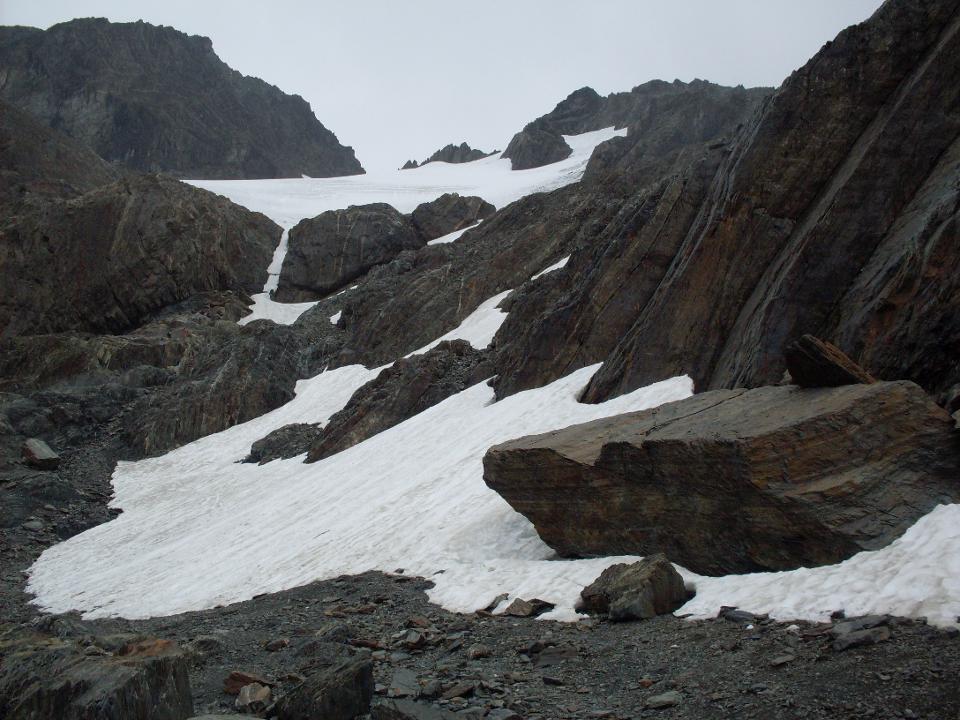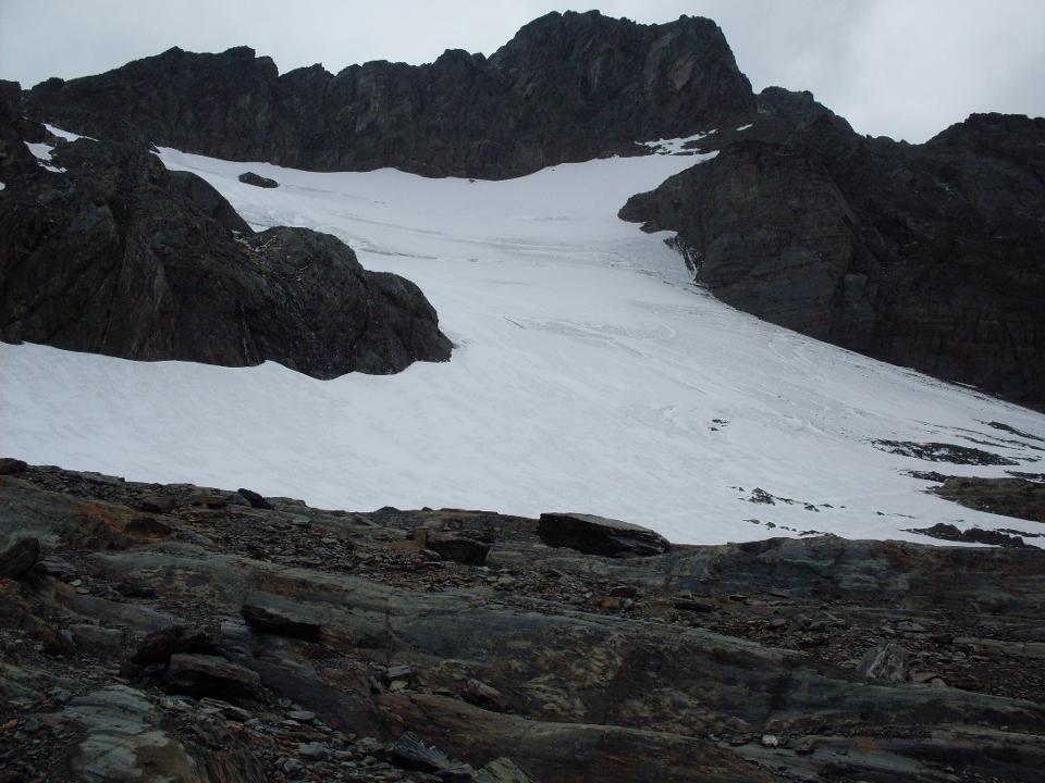 Finally after clamoring at a painfully slow pace up the steep path of loose gravel and sharp rocks that actually paralyzed me with fear a couple of times, we got close to the glacier itself, and honestly, I wasn’t that impressed. Of course the view of the Beagle Chanel and of the town was amazing and the mountains with the snow glinting off of them (in the middle of summer) were no doubt impressive, but if I had not known that the glacier was a glacier, I would have just thought it was snowfall on the mountains. I thought that where we stood was probably good enough especially since it started to snow. Not too hard, but enough to make me think that heading down rather than up was a stellar idea. But Adam wanted to get closer.